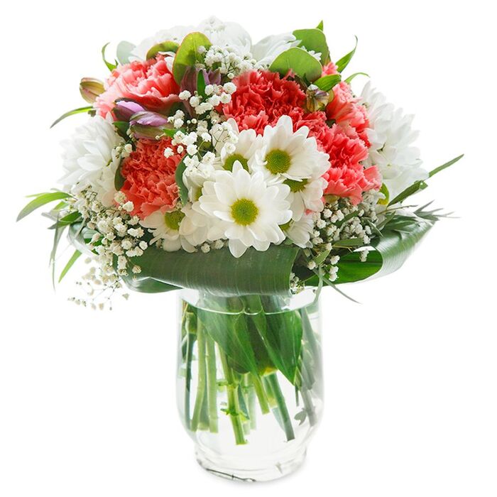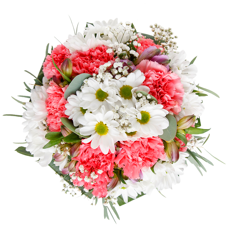 Delight someone special with our beautifully crafted bouquet, showcasing snow-white chrysanthemums, delicate gypsophila, and soft light pink carnations, intertwined with vibrant aspidistra leaves. This unique mix exudes elegance and warmth.